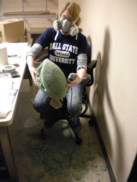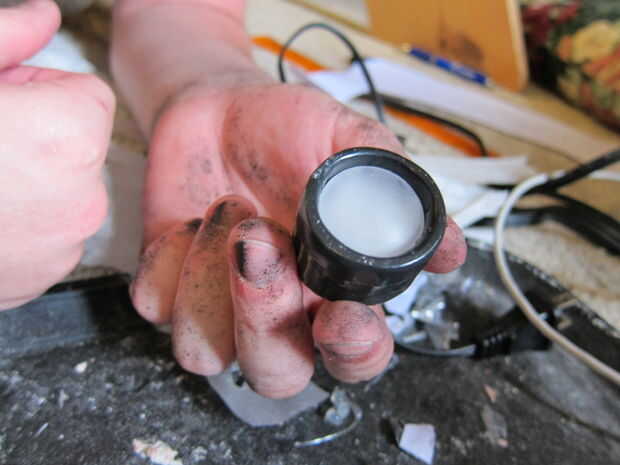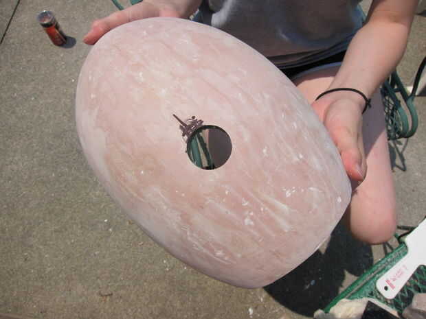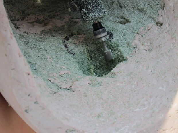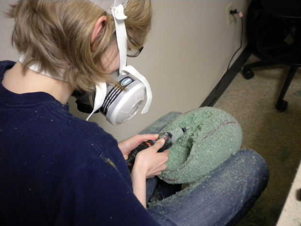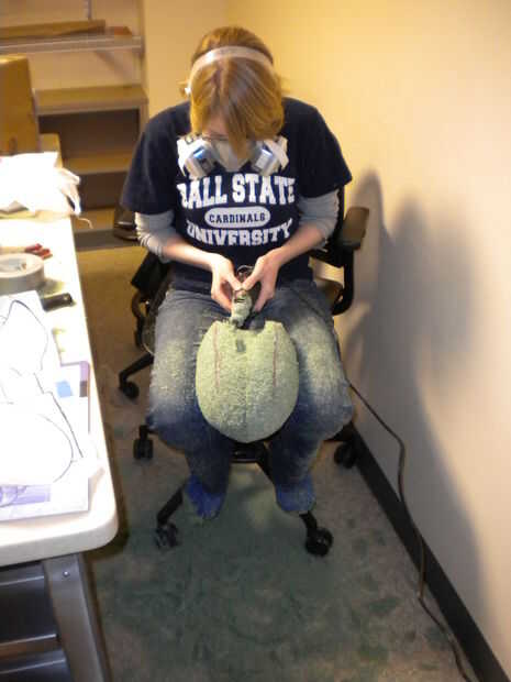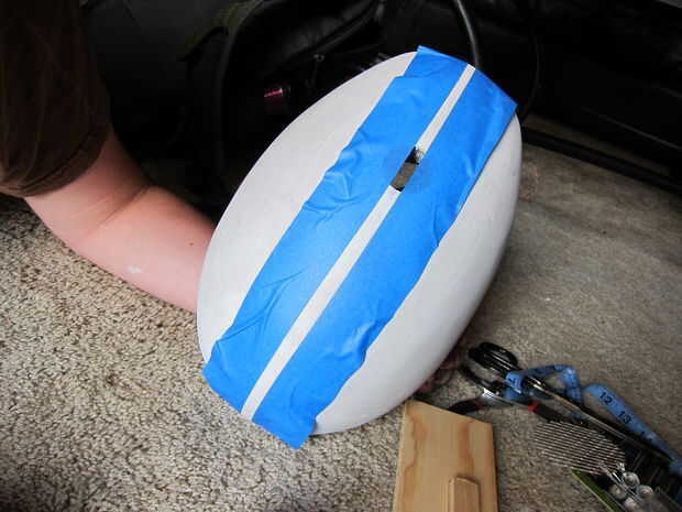 Bueno, después de la cáscara a la suavidad que estábamos buscando, el siguiente paso fue crear el orificio en la parte superior, dremeling la ranura a lo largo de la espalda y aplicando los tres nudos triangulares de donde los cables de los LEDs rojos se le tiró a través. ¡ Yay!