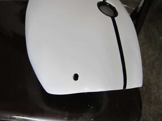 Para el taladro, simplemente utilizamos el taladro de mano. Con una 1 ¼" circular poco, nos posicionado centrado arriba hacia la parte delantera de la cáscara. La razón por la que hicimos un círculo de ¼" 1 era para que la luz (con la lente pulida) que se encuentra en ese agujero encajaría con un borde negro ¼th alrededor de él.
