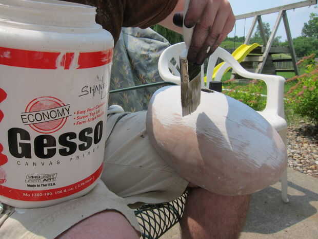 Ahora puede proceder con la pintura! Para crear una base uniforme, todo blanco, pintamos Gesso en primera. Creo que nos ponemos en cuatro o cinco capas de Gesso. Si arena la cáscara después de cada capa, hace más fácil lograr una suavidad final más adelante.