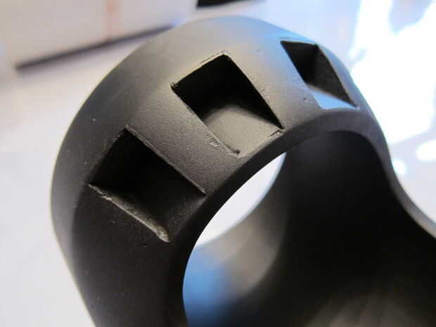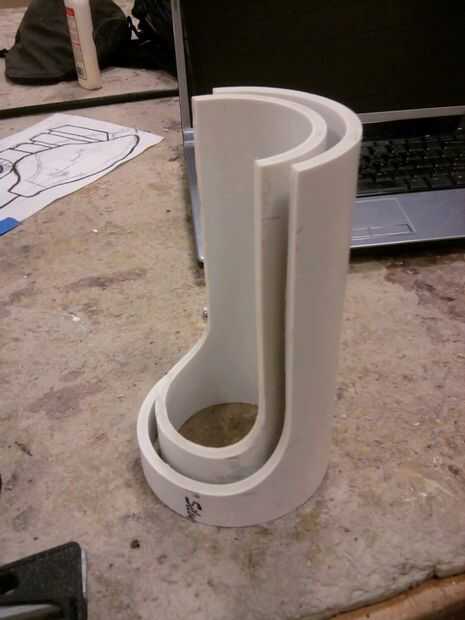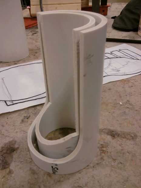 Corte de aproximadamente 8 pulgadas de tubo de dos tamaños para la primera parte de la base. Tiene cortado el tubo de tres pulgadas hacia abajo el centro de un extremo para cerca de 5 ½", entonces se dio una curva agradable fuera de la tubería en cerca de 6 ½", o una pulgada y media desde el otro extremo. ¿Que nos da una sección agradable fuera de la pipa, derecho? Para la tubería de cuatro pulgadas, cortamos unos 6 ½" un poco a la izquierda del centro – probablemente alrededor de la mitad una pulgada del centro – entonces lo curvas hacia arriba y afuera a unos 7/8" del final. Ayudar las fotos, te lo juro! En el segundo, verás que ambos tubos tienen el mismo punto medio--ya que estas son fotos de la primera base, que finalmente fue destruido. Terminamos pasando la línea de corte la cáscara externa abajo una media pulgada y resanding la curva para obtener lo que se ve en la primera foto.