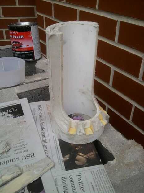 Bondo es una curiosa, curiosa sustancia. Naturalmente un color gris claro, cuando se mezcla con el compuesto, se vuelve un rojo tirando a rosado, se endurece totalmente en unos 20 minutos y es fácilmente sandable con lija de grano 80 de endurecimiento. Esto hace fantabulous de actuaci6n. Bondo es un desafío por sí mismo y si nunca lo has hecho antes, estar dispuestos a atornillar para arriba algunas cosas que aprender llegar a un color y consistencia utilizable varias veces. Una buena regla es para el valor de cada bola golf de bondo, agregue el valor de una moneda de diez centavos de endurecedor. Eventualmente, usted será capaz a primera vista, pero se adhieren a pequeñas cantidades de ambos comenzando hacia fuera. Comenzará a endurecer mucho más rápido de lo que piensa (tendrá unos 5 minutos de tiempo de trabajo real con él antes de que comience) y es inútil para el uso tan pronto como comience a gelificarse. Se puede lijar con lija de grano 80 para remoción de masa, luego 120 para el retiro del más fino. Acabados con 220 y luego un salto directo a 600, momento en el que es más suave que el de PVC que lo rodea.