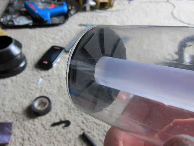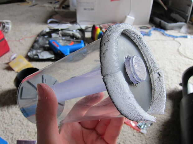 Los extremos de la Asamblea son corte de acrílico en la Sierra de vaivén y alisado con la dremel, con polígonos de acrílico cortados del mismo modo. Hay 8 polígonos por placa, con una placa en cada extremo del cilindro. Pegamento los polígonos a la placa, entonces usted pueden pegamento las placas al émbolo manejar una vez que todo está montado. Debe tener un poco de la empuñadura sobresaliendo más allá de las placas por lo que puede conectar las luces Si desea tenerlos, voy a explicar cómo en la siguiente sección.