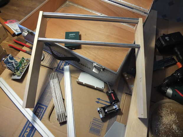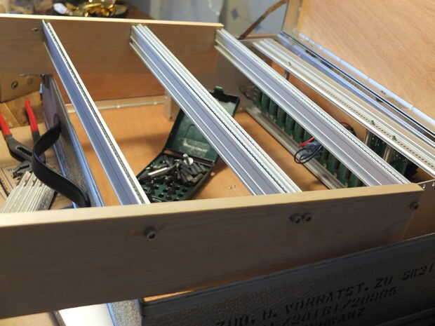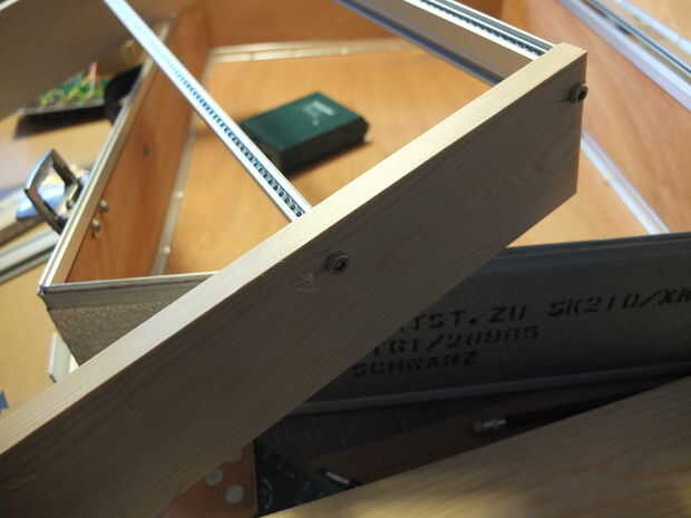 En primer lugar, cortar la madera en dos trozos del mismo tamaño (40 cm) y perfore los agujeros para sujetar los rieles. Atornille los rieles y un panel frontal ciego para comprobar la distancia entre los rieles. El panel frontal debe deslizarse fácilmente de izquierda a derecha dentro de los rieles. Repita los pasos con cada fila.