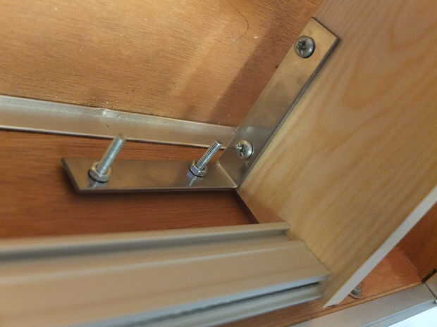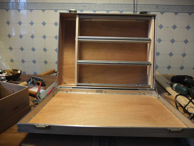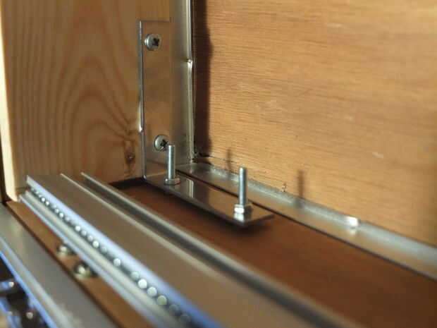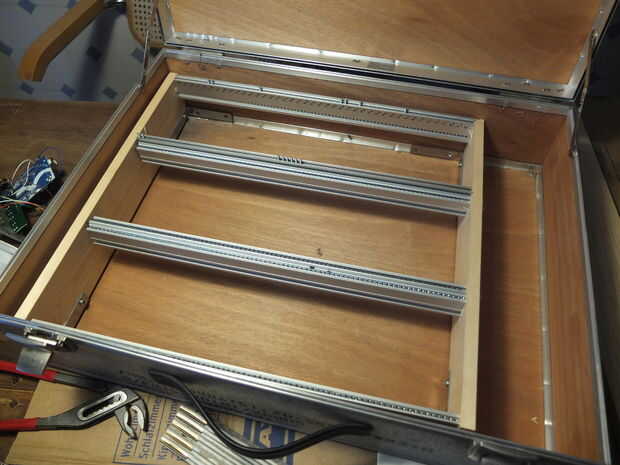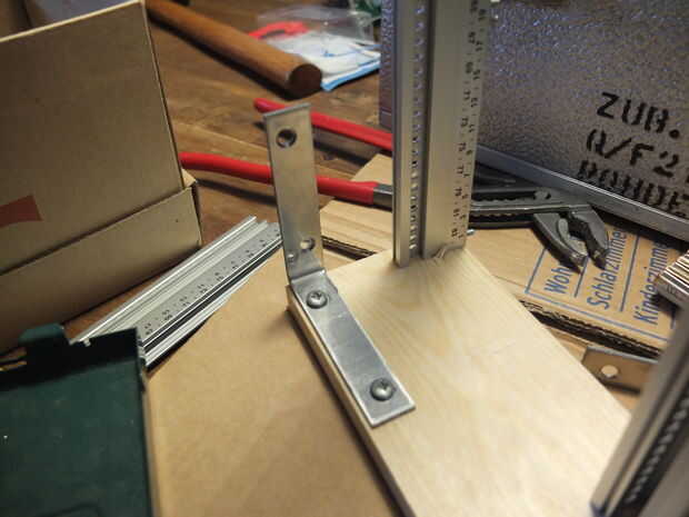 Instale un soporte en cada esquina inferior de la estructura hacia el interior. Coloque libremente en el caso y elegir la posición correcta (mina estaba en el lado derecho), luego marque todos los agujeros de los soportes de tocar el interior de la maleta. Perfore a través de las marcas y los pernos de lugar desde el exterior. Fijar el bastidor con las tuercas desde el interior y comprobar el resultado.
