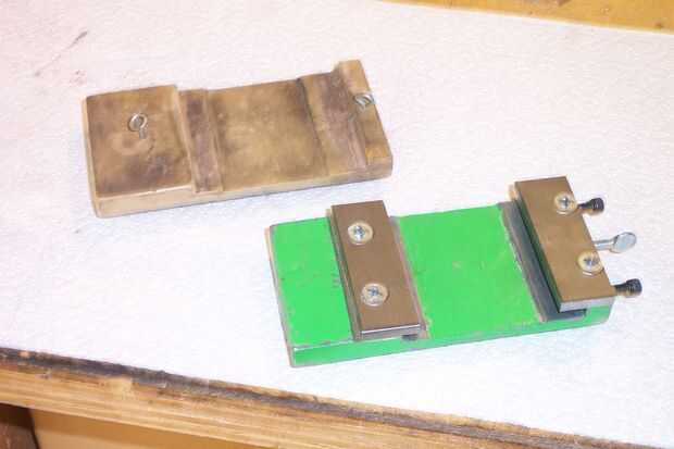 Aquí está una foto de la parte inferior, con las abrazaderas de conexión. Las cuñas (debajo de las pinzas) necesitan cierta fijación - está cortados de una lata de cerveza, y finalmente encontré alguna acción de cuña bronce buena en varios grosores.