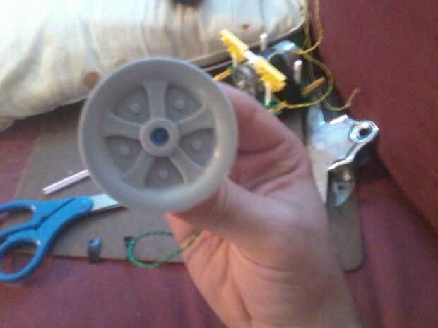Ahora que tienes la paja en el lugar y dejar que el pegamento fijar algunos, coloque el disco sobre la pieza de paja, si tienes suerte va a ser un ajuste perfecto y todo lo que tienes que hacer es añadir un poco de pegamento de modeler para fijarlo en su lugar, si eres como yo y tienen un conjunto más amplio que la paja es gruesa , tomar otro trozo de cinta aislante y abrigo sólo 1 capa sobre la paja, luego alimentar la rueda sobre la paja.