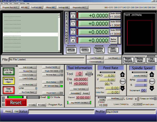 El software que controla la máquina es un intérprete de Gcode. Cuando usted utilice un concentrador USB, como se explica en sistema eléctrico), tendrá su propio software. Si utiliza el puerto paralelo de impresora en un equipo más viejo, usted puede elegir su propio. Opté por usar Mach3 que es utilizado por la mayoría de aficionados. Usted puede encontrar mucho sobre él en foros y en google. Desde Mach3 tiene muchas opciones y funciones, no les explico. A jugar con él y le descubrirá sus secretos :-)
