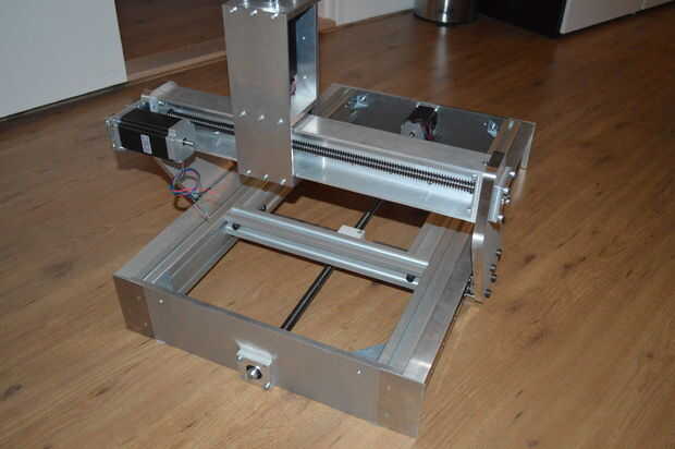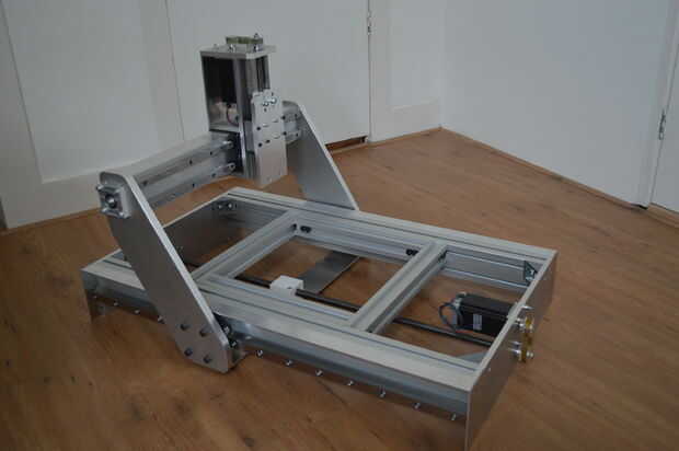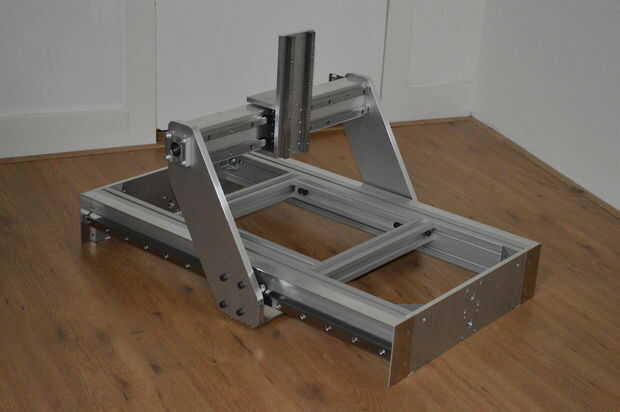 El último movimiento es lo que llamo la Stepermotorhousing para el eje z (más el eje sí mismo del curso). Se construye fuera de un frontal montado sobre el eje y lineal guiderails, 2 placas de refuerzo, un montaje del motor y una placa. En la placa frontal se montaron 2 guiderails lineales para el eje z en que se colocó el Mountingplate para el motor de fresado con los bloques de corredor.