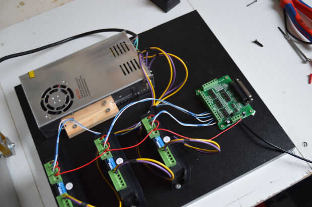 Opté por comprar un sistema completo en Ebay con 3 motores de pasos Nema 23, 3 conductores adecuados, un tablero de arranque y una fuente de alimentación V 36. Yo uso un paso conversor para convertir los 36 voltios a 5 voltios. Por supuesto también puede colocar a su propio conjunto. Puesto que no podía esperar a sartup la máquina temporalmente montara todos los controladores y fuente de alimentación en un tablero abierto. El recinto está en la fabricación.