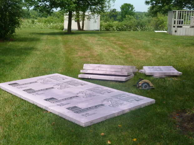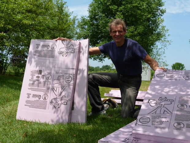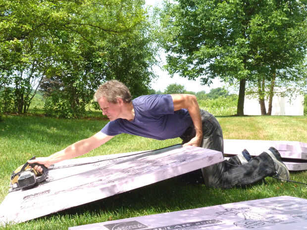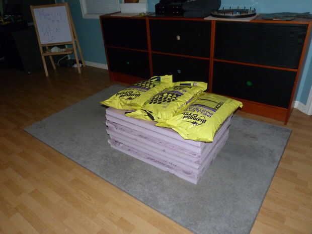 Mencioné anteriormente que he utilizado Dow Foamular aislamiento de espuma rígida como el material primario para este proyecto. Incluso una de 2" hoja gruesa era demasiado fina para una escultura de tamaño natural, así que le corte las hojas en secciones (para que quepa en mi máquina CNC) y pegamento entonces dos de ellos para crear un billete de 4" de espesor. He utilizado adhesivo en aerosol de 3 M 78 de aislamiento de espuma de poliestireno y peso los billetes con tres bolsas de 50 libras de sal del ablandador de agua para asegurar una buena adherencia.