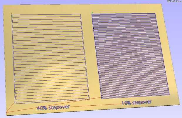Ancho de paso es el porcentaje del diámetro del pedacito que la trayectoria se mueve para crear el pase lateral colindante (no confundir con un pase vertical cuando se habla de profundidad de corte). Con un ancho de paso alto (como el 40%), ver fácilmente los cantos entre cada pasada y con un ancho de paso bajo (5% - 10%) llegan a ser mucho menos visibles. La contrapartida es que valores de ancho de paso bajo pueden aumentar dramáticamente tiempo de mecanizado ya que hay un mayor número de pases laterales. He incluido una captura de pantalla que ilustra el concepto de ancho de paso