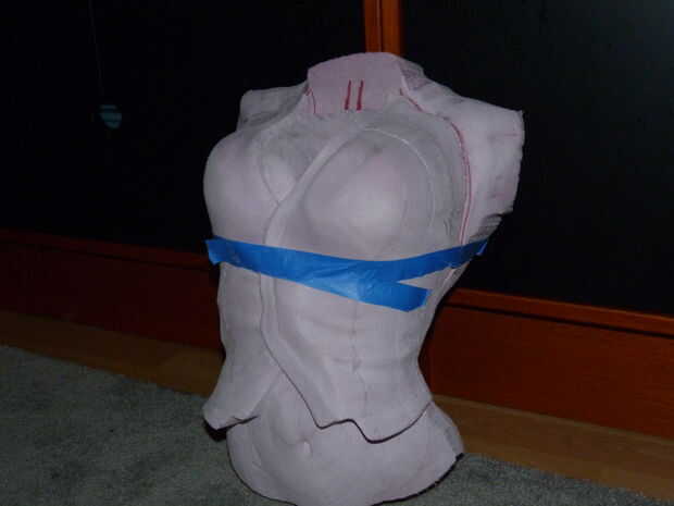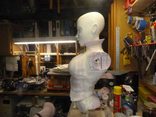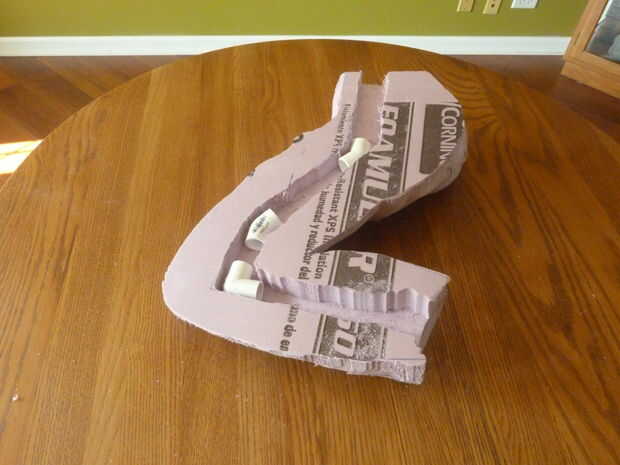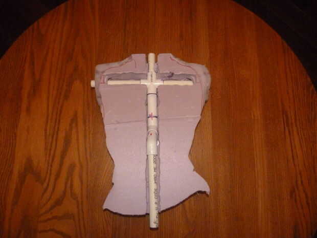 Tomar alguna planificación sobre exactamente cómo desea atar que todo porque una vez pegado, lijado y sellela, no hay vuelta atrás. 1/2" PVC utilizado para la armadura tiene un diámetro exterior de aproximadamente una pulgada, así que creado canales ligeramente sobredimensionados en las extremidades, torso y rocket pack para que el PVC residir. Entonces usé creciente aislamiento de la espuma del aerosol como "Grandes cosas" para fijarlo.