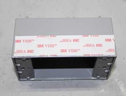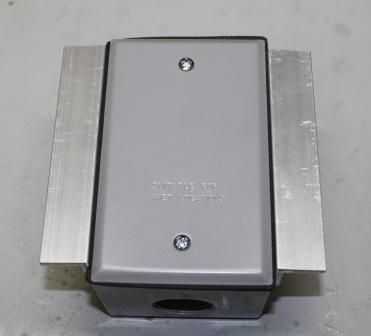 Temporaraly Instale la cubierta en su caja eléctrica Pele el papel de la parte exterior de la cinta echada a un lado 2 a continuación, coloque la caja eléctrica boca abajo sobre una mesa plana. Pegar los soportes de montaje de la cinta de doble cara. Porque no son rectos los lados de la caja eléctrica los soportes no quedará al ras con la parte superior de la tabla pero esto está bien.