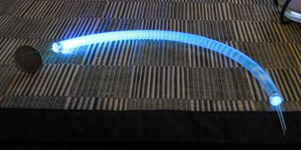 Curiosamente, comencé con leds de UV y encontró que funcionan pero no son tan efectivos en floración es como el de LED azul. Mina son 470nm y mi UV unos eran 405um. También la cantidad mínima de troquel necesitada fue una sorpresa. También probé un rotulador fluorescente naranja y rosa pero no se donde cerca de tan brillante.