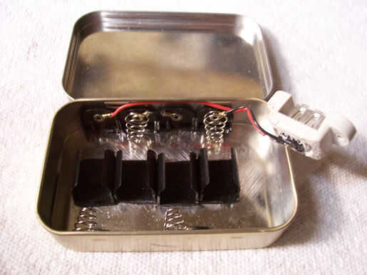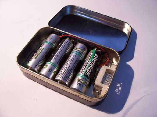 Tengo la idea de un artículo de ladyada donde construyó una batería de 2 x AA en una lata de goma pequeñas de Altoids de. Mientras trabaja y es súper portátil, utiliza un sistema de gestión de la alimentación que requiere piezas exóticas (pero usted puede apenas comprar el conjunto menos Altoids de ella). Además de la corriente de salida se limita a acerca de 200mA. En ninguna parte cerca suficiente energía para lo que necesito.