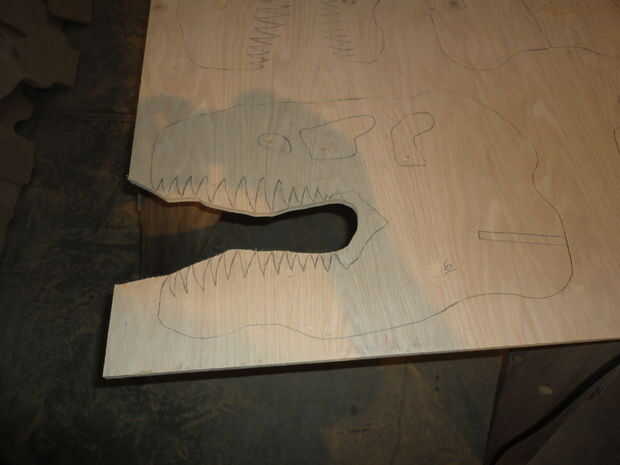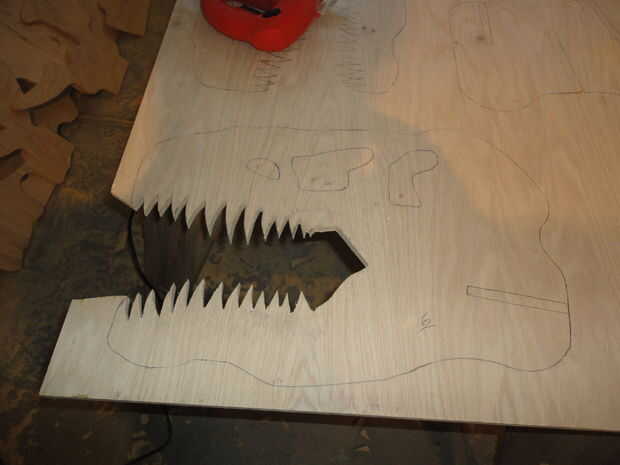 Sobre las piezas del cráneo, empezar por cortar la boca, en la parte superior de los dientes. Luego volver y cortar cada diente individual. A continuación, perfore un agujero en cada una de las tomas craneales y cortar estas así. Por último cortar la cabeza de la madera contrachapada.