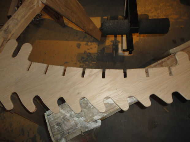 Tomar un trozo de madera y ejecute el router a lo largo de ambos lados. Ajuste la profundidad de la ronda a su gusto. Para mi 1/2" madera contrachapada gruesa fui con aproximadamente 3/16" radio ronda. Ejecute el router todos los bordes de las piezas, a excepción de los dientes. Estos verán mucho mejores si sostenido a la izquierda. En algunos de los pedazos más pequeños yo al revés el router y funcionó la pieza sobre la parte superior de la misma. Esto funcionó bien, pero es bastante peligroso así que - muy - ten cuidado si tratas de esta técnica.