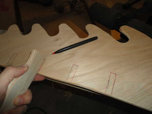 Tomar otra pieza de madera de desecho y utilizando como guía vuelva a marcar las muescas en cada pieza. Estos planes fueron originalmente tamaño de madera contrachapada de 1/2", si utilizas 3/4" o una combinación de ambos, va a necesitar ajustes a realizar. No vuelva a marcar las muescas nubladas pedazo 8 hasta que las muescas se han cortado de la pieza 9. En 8 las muescas deben estar alineados con las tres muescas en la pieza 9.