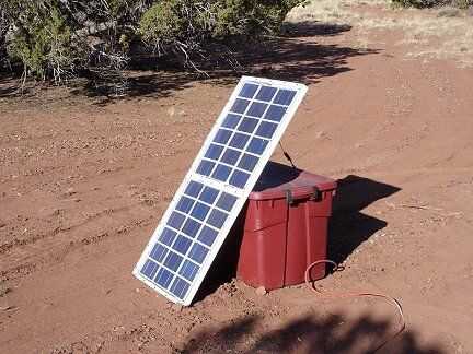 Aquí está una foto del panel solar en acción, proporcionando la necesaria energía en mi propiedad remota de Arizona. Usé un viejo cable de extensión para llevar la energía desde el panel ubicado en un claro soleado sobre a mi camping debajo de los árboles. Me corte las puntas originales del cordón e instalar tapones de Jones. Podría seguir con los conectores originales de 120V, pero quería asegurarse de que no había absolutamente ninguna posibilidad de conectar accidentalmente el equipo de baja tensión DC a 120V CA.