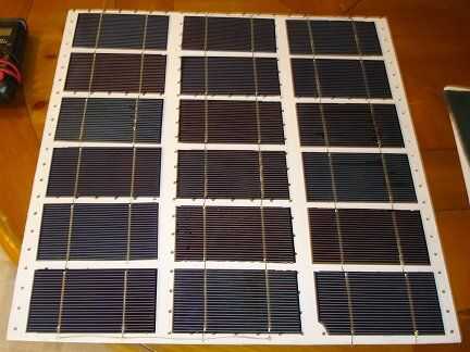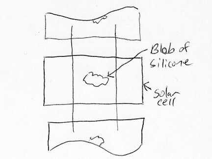La próxima vez lo haré diferentemente. Se soldadura de fichas sobre las espaldas de todas las células solares. Entonces yo se adhiera las células en sus lugares apropiados. Luego se soldar entre sí las pestañas. Parece que el camino obvio a seguir a mí ahora, pero tuve que hacerlo de la manera dura una vez a la figura hacia fuera.