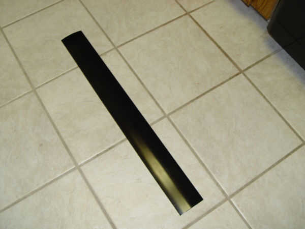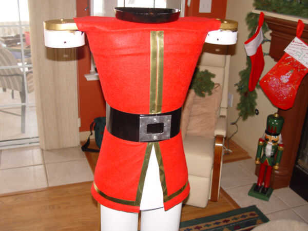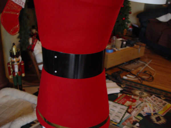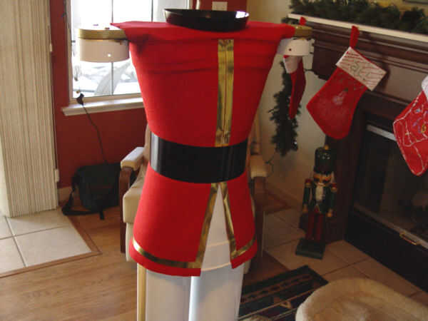 Para la correa usé una sección de una ventana rota vertical ciega que tenía puesta alrededor. (Foto 1) Si comprado nuevo, el costo para el uso de una persiana vertical sería aproximadamente $12 que sería material suficiente para hacer dos cinturones. Mida alrededor de la cintura del torso y cortar a ciegas usando unas tijeras pesadas. Pintura del negro del lustre de ciego. (Foto 2) Envuelva la cinta alrededor de la cintura y mantener en su lugar con dos tornillos en la parte posterior. (Foto 3) El cinturón debe cubrir la junta entre la parte superior y más bajo uniforme material todo el camino alrededor de la cintura. (Foto 4)