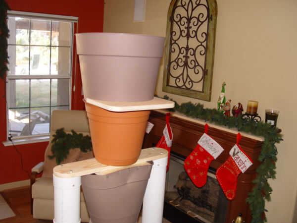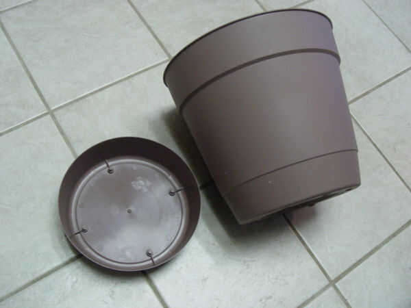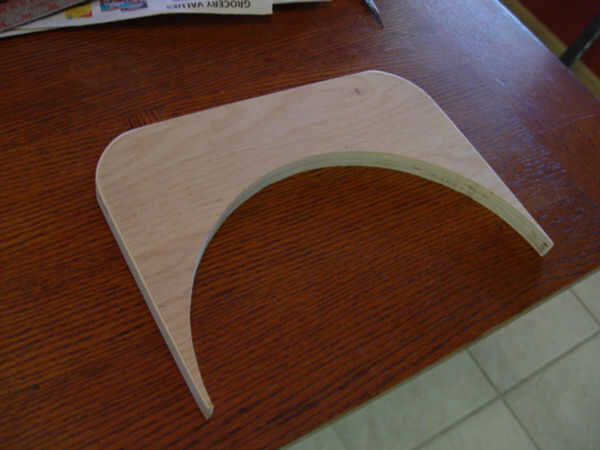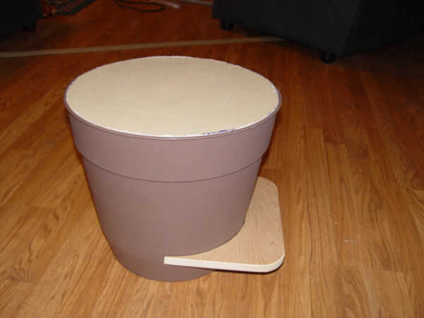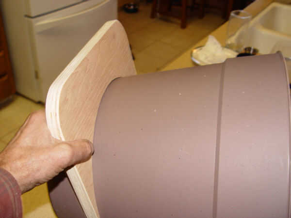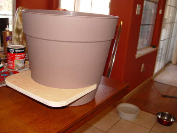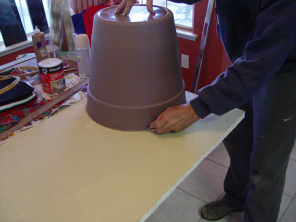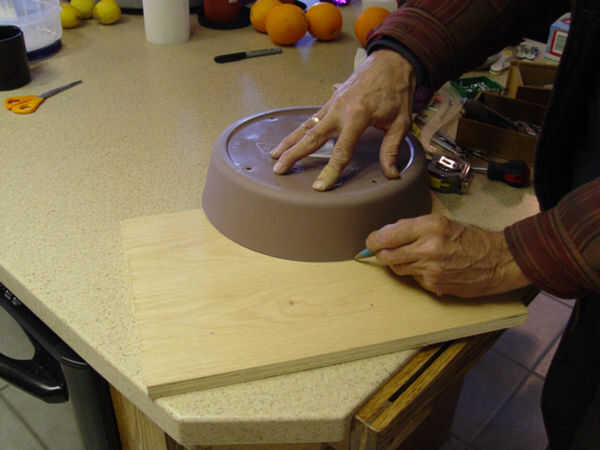 El sombrero está hecho de otra maceta siembra, este uno 14" altura con un diámetro de 15" apertura en la parte superior. Para crear el proyecto de ley para el sombrero, retire el plato de goteo de la parte inferior de la olla. (Foto 1) Guíese por el extremo más grande de lo platillo de goteo para dibujar un semicírculo sobre madera contrachapada de 3/4". (Foto 2) Forma el borde externo del proyecto de ley como mejor parezca. Hice mi proyecto de ley para extender 4" hacia fuera del sombrero y luego utiliza una lata de pintura para dibujar las esquinas exteriores curva del proyecto de ley. (Foto 3)