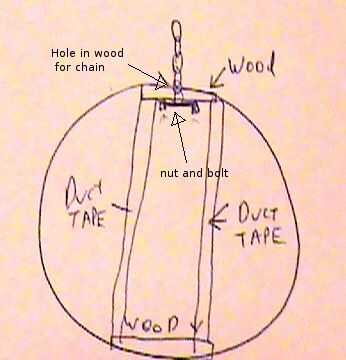 Para la cadena para la piñata. Perfore un agujero de sólo lo suficientemente grande como para que una cadena para pasar en un pedazo de madera del tamaño de la parte superior de tu piñata. (Mi pieza era 10 "x 4" amplia). Entonces se inserta la cadena. Cuando vino a través en el lado opuesto puse una tuerca y un tornillo para evitar tirar a través. Éste era el soporte superior, para apoyar la parte inferior sólo corrí cinta hasta otra pieza de madera en la parte inferior. Envuelto en un par de veces hasta que pensé que era lo suficientemente fuerte como para soportar el peso.