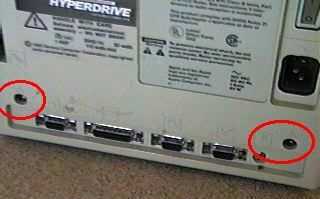 Foto 3 - quitar los dos tornillos Torx de la parte inferior de la caja. Nota la etiqueta de "Hipervelocidad". Este fue un hack de disco duro interno para los primeros Mac. Muy chulo, muy caro.