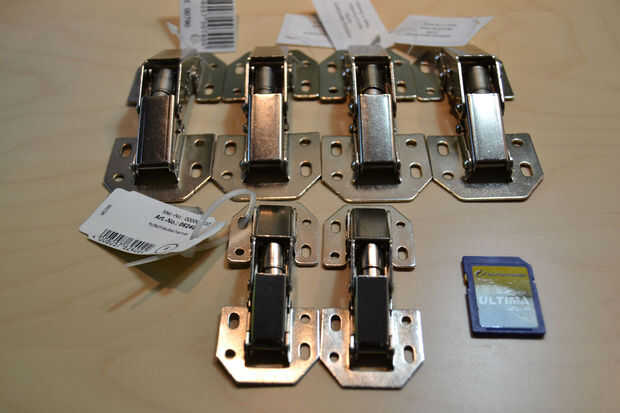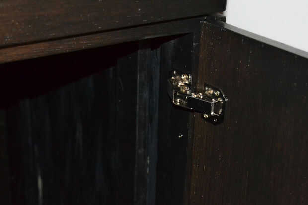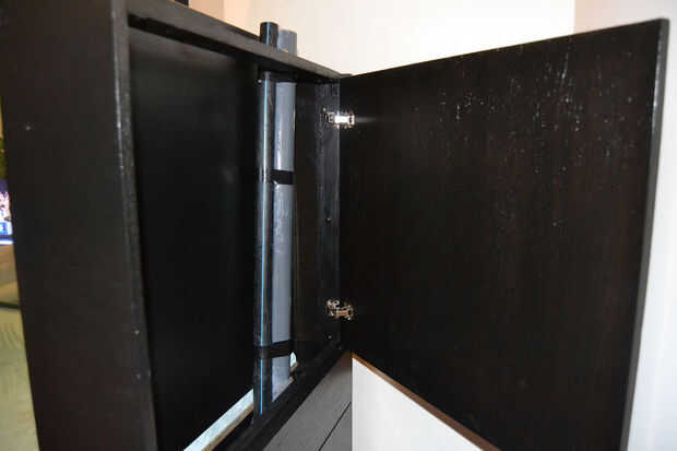 Era hora de cerrar las puertas. Compré unas bisagras (probablemente tienen algún nombre específico pero no lo sé) que permiten el movimiento que se necesita para cumplir con el diseño que elegí. El fino espacio entre entre la puerta y las otras partes de la capa externa no permite una articulación normal para trabajar. Para asegurarlos simplemente usé algunos tornillos para madera.