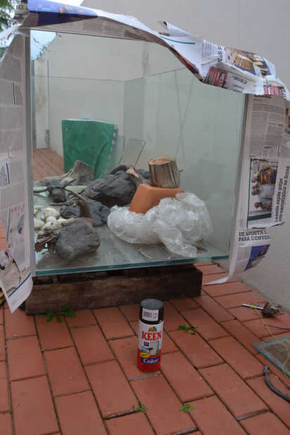 El acuario va en la parte superior una esponja aislante gruesa para prevenir cualquier irregularidad en estar en contacto con el vidrio inferior. Luego la esponja va encima de una hoja de contrachapado de 10 mm que se colocan en la estructura de acero.