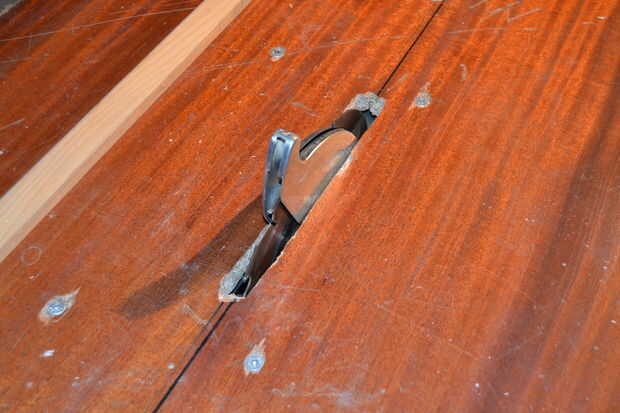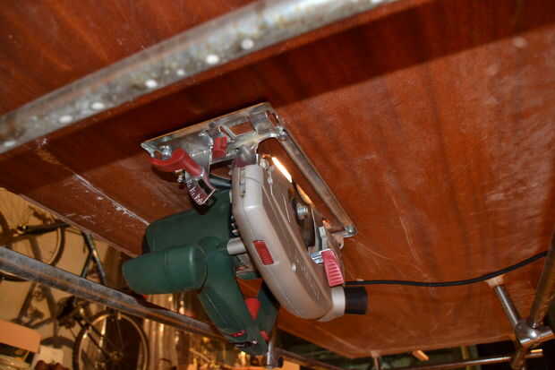 He perforado unos agujeros en una hoja de madera vieja (de una puerta vieja que creo) y acabó abriendo un agujero para la Sierra de mano con una sierra de vaivén. Que yo simplemente atornillada la mano vio a la mesa y había asegurado el botón con una atadura.