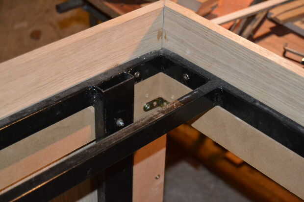 En algunos rincones donde con a grado dos 45 piezas la Unión no era perfecta así que tuve que rellenar los huecos con una mezcla de aserrín y pegamento de madera. Sólo tiene que añadir serrín (recogido de la Sierra de mesa) a poco de pegamento hasta que la mezcla quede muy gruesa. Entonces sólo aplicarlo a la distancia. No se ve como madera pero es lo mejor y pues en mi caso el soporte chapeado a un color oscuro incluso no notarlo.