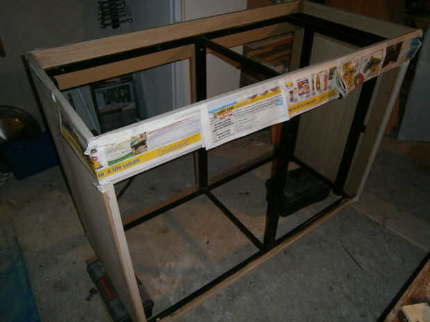 Usé MDF para el interior porque es era más barato y es una parte menos noble del soporte, pero yo sabía que tenía que evitar que el agua entren en contacto con él. Mientras que 'ventana de compras' en el equivalente local de Home Depot creo (Leroy Merlin o AKI) encontré este gran producto. Su caucho líquido y está diseñado para la impermeabilización de los techos y cemento en terrazas. Si bueno para lo impermeabilización en el exterior es sin duda suficiente para el eventual derrame que siempre pueden pasar por debajo de un acuario.