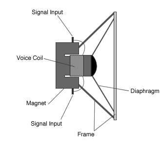 Para aquellos que no están familiarizados: hablante se basa en la idea de electromagnetismo; pasar una corriente por una bobina de alambre y crear un campo magnético. colocando un imán permanente en medio de esta bobina y el cable activo se sentirán atraídos a él. Si la corriente que pasa a través de la bobina tiene la forma de una señal de audio, la bobina se moverá hacia arriba y hacia abajo para que coincida con la onda. Cuando esta bobina está conectada a un cono, también llamado diafragma, el cono de crear vibraciones en el aire. Estas vibraciones son ondas de sonido.