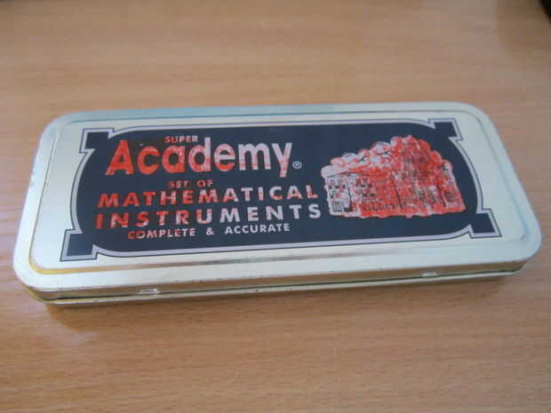 Tengo este envase de la lata de primer grado. Tenía algunas reglas e instrumentos de matemáticas. Ignorar el colorante rojo horrible.