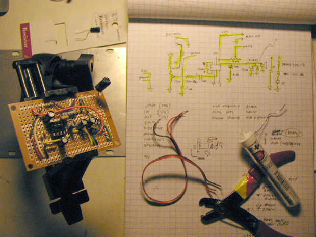 Para este circuito, todas las conexiones que no fueron hechas por el protoboard existente se realizaron con cable de conexión de color. Que sea un punto de color-código las conexiones; es mucho más simple diagnosticar y reparar el cableado que es uno mismo-documentación! En este caso, el color es adecuado para los paquetes que van a las tomas y los interruptores del panel frontal.