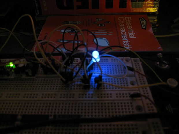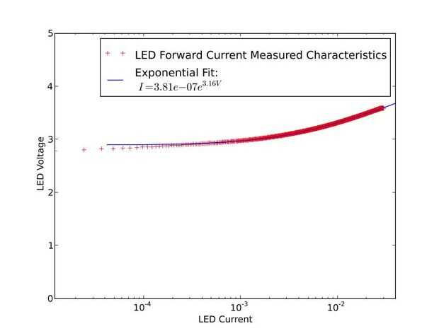 Aquí están los resultados para un sin nombre 5mm UV Led - lamentablemente su color violeta intenso no aparece en cámara y se ve más azulado en la foto. Como era de esperar, tiene una alta tensión en toda su operación, con una mejora dramática en tensión directa como paso de la corriente alrededor de 10 mA debido a la Resistencia óhmica se mencionó anteriormente. Una cosa para recordar acerca de conducción LED con corrientes de DC es que casi toda la "acción" con respecto a brillo ocurre en el extremo inferior, y hay una región de los rendimientos decrecientes donde incrementar la corriente no aumenta el brillo aparente mucho. Por ejemplo, con este LED no hay valor de un centavo de diferencia entre su brillo a 10 mA y 30 mA, y sin embargo el voltaje en el LED aumenta substancialmente. Hay ningún punto en la conducción de ellas con un DC actual más alto de lo necesario para un brillo máximo - está perdiendo energía! (Pulsada en coche es otra historia, ver: