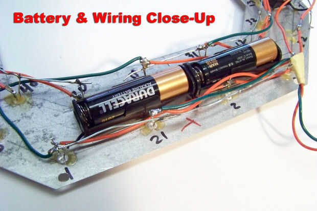 Después de taladrar los agujeros en la placa del reflector de LEDs, que son sólo lo suficientemente grandes como para que la parte delantera de la lámpara, usé un papel de lija fino en una lijadora orbital pequeña darle la superficie delantera toda una agradable, suave y brillante calidad reflexiva. He puesto los LEDs en los agujeros asegurándose de que los polos negativos de los LEDs fueron hacia el borde más cercano (ya sea fuera o dentro del anillo). Luego puse una gota de pegamento del gorila en cada LED para mantenerlos en su lugar. También pegué cada uno de los titulares de cuatro baterías en su lugar.