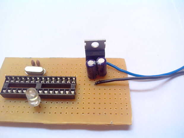 Después de quemar correctamente el cargador de arranque permite completar el arduino. Agregar 5v regulador es una parte importante del circuito, para el regulador de tensión que utiliza un IC l7805 que comúnmente se encuentra en internet. Con el lado impreso de la IC frente a usted y las piernas hacia abajo a la izquierda extrema es la de entrada. Es el que está en el centro y el de le extrema derecha es la salida.