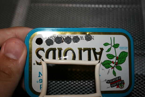 De todas las decisiones de diseño que hice, la decisión de usar una lata de la menta Altoids como un caso quizá fue la más desastrosa. El problema no es con la bandeja de sí mismo, sino las herramientas que tenía disponibles en la preparación del caso y el hecho de que he hecho muy poco trabajo con el metal de hoja fino. En primer lugar, utilice la herramienta correcta para el trabajo. Tijeras para chapa, la lata o al menos el que usé, rasga para arriba el metal en lugar de cortarlo limpiamente, dejando duro quitar filos que no quedan planas al caso. Use una cortadora. También, cuando taladre agujeros, perforar siempre desde el lado de acabado, o que usted verá más a menudo (exterior), siempre que sea posible. Cuando se taladra un agujero es probable dejar rebabas en el metal y el metal se dobla en el orificio de la dirección que. Por la perforación desde el exterior, dejas las rebabas en el interior de la caja, haciendo que fuera más ordenado aspecto y más seguro para personas distraídas.