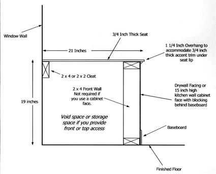 En www.askthebuilder.com encontré un bosquejo de la estructura de un asiento de la ventana (Foto 2). La altura que se los recomiendo es de 19" con un asiento profundo 21". Se puede ver en el dibujo que un asiento de ventana es en realidad un corto flotante pared achored a 2 x 4 grapas en la pared. El frente puede ser de madera, yeso u otros materiales ya que es sólo decorativa. Único lo que hice diferente del dibujo era colocar el 2x4s borde en comparación con la estructura típica de la pared. Esto hace una pared lo suficientemente fuerte y crea también un poco más espacio de almacenamiento en el Banco.