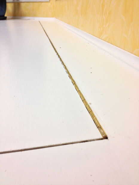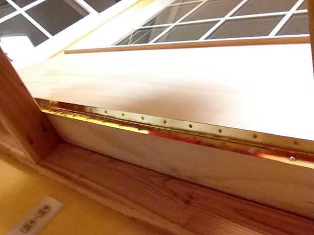 Antes de pegamento y clavo que el 5" nuevo pieza en su lugar, es mucho más fácil seguir adelante y coloque la tapa a la misma. Este es un trabajo que no quieres hacer desde dentro de la caja. Cuadro 3 muestra cómo se une una bisagra de piano. Una bisagra de piano es una bisagra continua larga que es muy fuerte y una solución perfecta para este proyecto. Bisagras de piano comúnmente vienen en versiones de 30" y 48" y 48" habría hecho el trabajo. En cambio opté por usar dos bisagras de 30" por lo que se llenaría el espacio entero. Esto era más fácil que entallar un espacio para la articulación de 48". Bisagras de piano se puede cortar a la longitud deseada con una sierra o Amoladora portátil. Las bisagras usé tienen lados que son 3/4" de ancho por lo que había montado al ras con la parte inferior de la 3/4" madera contrachapada. En el cuadro 4 ves que las bisagras sobresalen un poco pequeño pero no es sensible cuando la alfombra en la colocación en la parte superior.