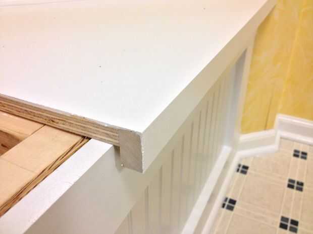 Ahora ponga todo junto con algunos clavos líquidos y algunos sólidos clavos. Pone abajo una tira de Liquid Nails en el 2x4s que están debajo de los 5" nuevo pedazo y clávelo en su lugar. Luego hacer lo mismo con las piezas 2 laterales. Asegúrese de que evitar que el adhesivo debajo de la tapa--especialmente cuando colocación y clavado de las piezas laterales. La última foto es la Cala 3/4 moldeado a lo largo del borde superior del asiento de la ventana. Me gusta Caleta moldeo por aquí pero también puede usar un pedazo más grande del ajuste o a un cuarto redondo.