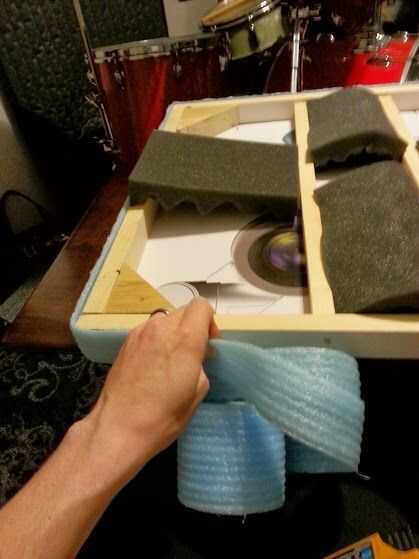 Ahora, una vez que podemos escoger espuma. Tengo dos tipos de espuma. Recuerde, estamos tratando de hacer que la superficie no uniforme como posible. ¿Visto espuma de real studio? Parece que la espuma del cajón del huevo gris oscuro abajo. Es así que el sonido se refleja en varias direcciones diferentes, dispersión de la energía en cantidades pequeñas, manejables. Así que lo que no queremos hacer todo esto completamente incluso detrás de la camisa. Las esquinas del marco y refuerzos de madera ayudará un poco, pero tenemos que hacerlo también con la espuma.
