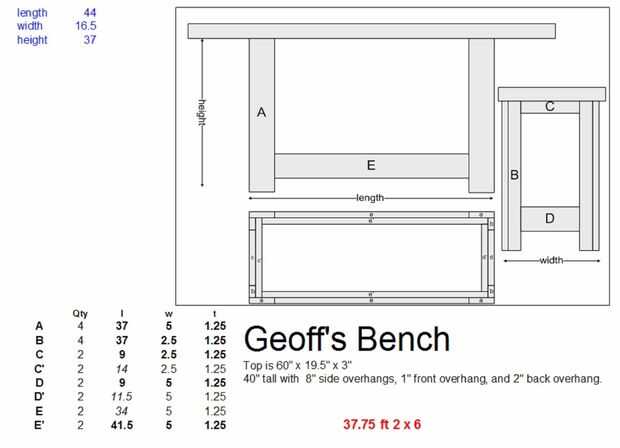 Después de haber procurado una mesa que necesita para el diseño de la base se sienta en. Mi hijo es alto y no utiliza herramientas de mano así que quería un banco de 40" de alto. Quiere que la parte superior a cada lado por 8", el frente por 1" y la parte de atrás por 2" de la proyección. Desde la parte superior es 3" de espesor, esto significa la necesidad base 44" (60-8 - 8) de largo. 16-1/2"(19-1/2 - 1-2) de ancho y 37" (40 - 3) alto. He incluido una hoja de cálculo que le permite ingresar estos tres valores y generará una lista de corte. Incluso tiene un grande de la célula para agregar notas acerca de su diseño específico.