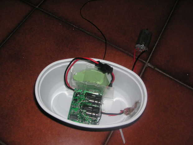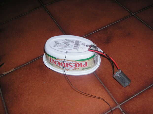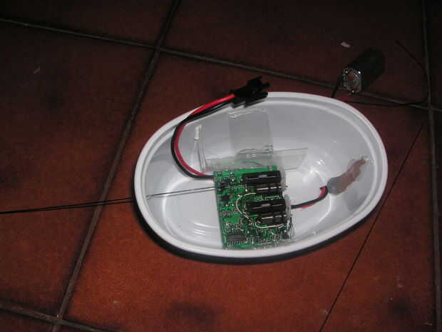 Lo primero que hice fue pegar el chip principal dentro de la tina de mantequilla. Entonces hice un agujero para los cables que el motor y otro para la antena. Yo los impermeabilizada con una pistola de pegamento (realmente hice toda la pega e impermeabilización con mi pistola de pegamento.)
