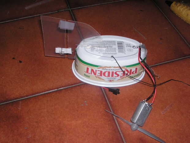 A continuación, cortar el lado plano de la caja de tic tac (para minimizar la resistencia del aire) y había utilizado como un soporte del motor. Caliente pegué el motor a la parte superior. Cuando se utiliza, el motor se calienta, pero no caliente lo suficiente como para derretir el pegamento o debilitar significativamente. Los controles de la embarcación y motor ahora están completados.
