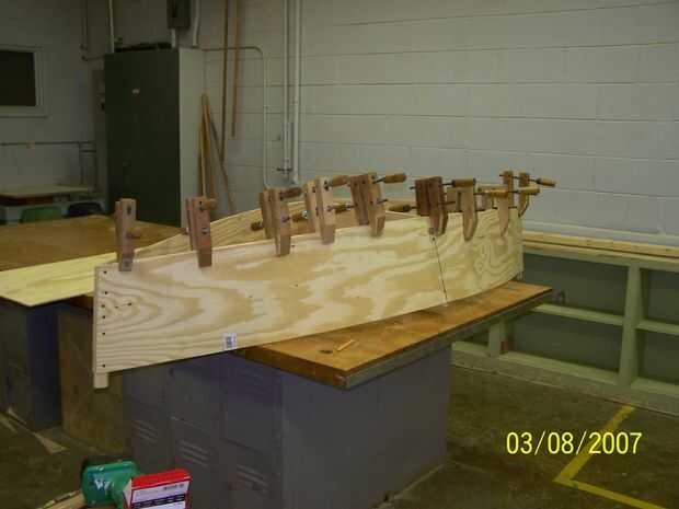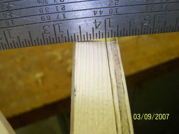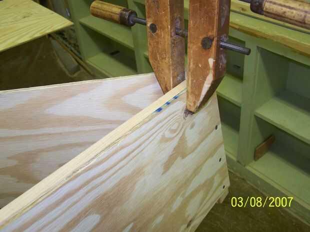 Utilice el triángulo ajustable para medir el ángulo entre el el stempost y el lado interior. Marque esto y corte el ángulo con la Sierra de mano o con la sierra.
