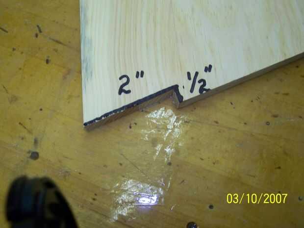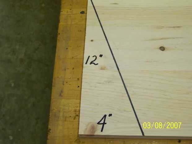 Mis dimensiones finales terminaron con la parte superior a 30 3/4 de pulgada, base 22 1/2 y la altura de 12 pulgadas. Hay dos formas para determinar el ángulo de corte esta en la tabla VI. Usted puede utilizar el triángulo ajustable o situado en la cima de la sierra y alinee con la ranura de inglete. Afloje el calibrador de ingletes y deslícelo hasta el marco y el ángulo en lugar de la cerradura. (Tendrá que salvar a uno de los triángulos que corta para ajustar la inclinación de la hoja para los registros de chine).