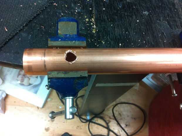 Corte pedazos de tubo de 2 x 3cm largo 15mm, utilizando una lima redonda crear un bosquete redondeado en el extremo del tubo para que quede alineada contra el tubo de 28mm, ahora esto de la soldadura sobre uno de los orificios perforados y hacer lo mismo en el otro extremo, encontré utilizando una abrazadera para sujetar en posición ayudó a.
